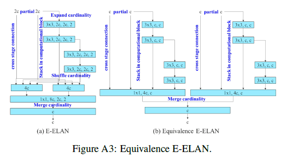 在第3.1部分我们也提到过,对于E-ELAN框架,由于我们的edge devide不支持分组卷积和channel shuffle操作,所以采用了如FigA3(b)中的等价形式: