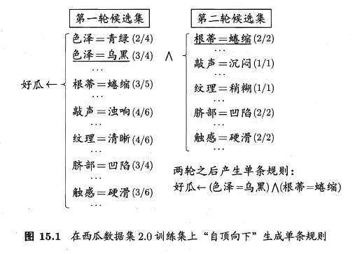 \[好瓜 \leftarrow (色泽=乌黑)\]然后,对上面这条规则覆盖的样例,通过第二轮评估可发现,将图15.1中的五个逻辑文字加入规则后都能达到100%准确率,我们将覆盖样例最多、且属性次序最靠前的逻辑文字“根蒂=蜷缩”加入规则,于是得到结果: